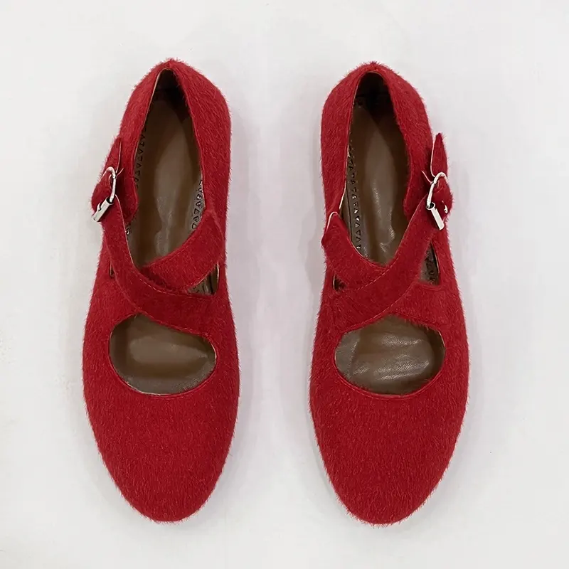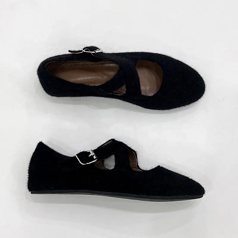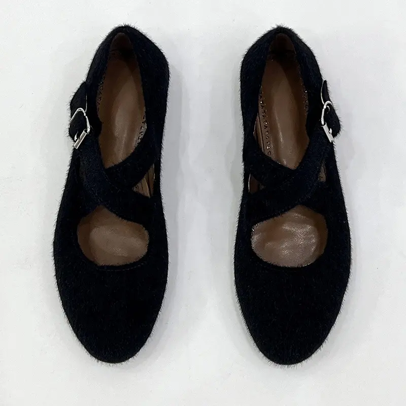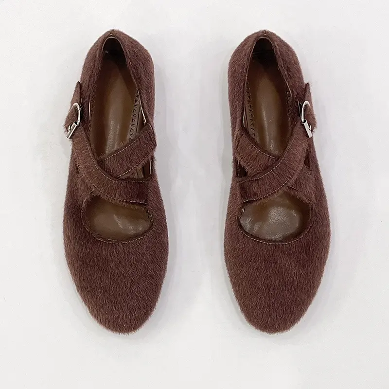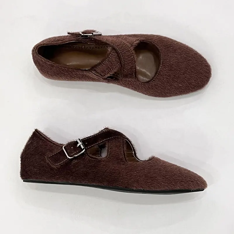 Fashion comfortable Women horse fur buckle strap casual flat shoes